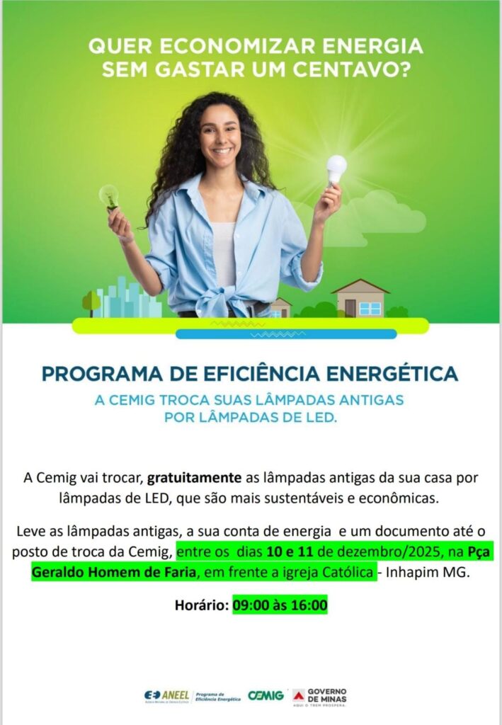A Companhia Energética de Minas Gerais (Cemig) realizará, nos dias 10 e 11 de dezembro, uma ação do Programa de Eficiência Energética em Inhapim, oferecendo troca gratuita de lâmpadas ineficientes por lâmpadas de LED. A atividade acontecerá na Praça Geraldo Homem de Faria, em frente à Igreja Católica, das 9h às 16h. A iniciativa tem […]