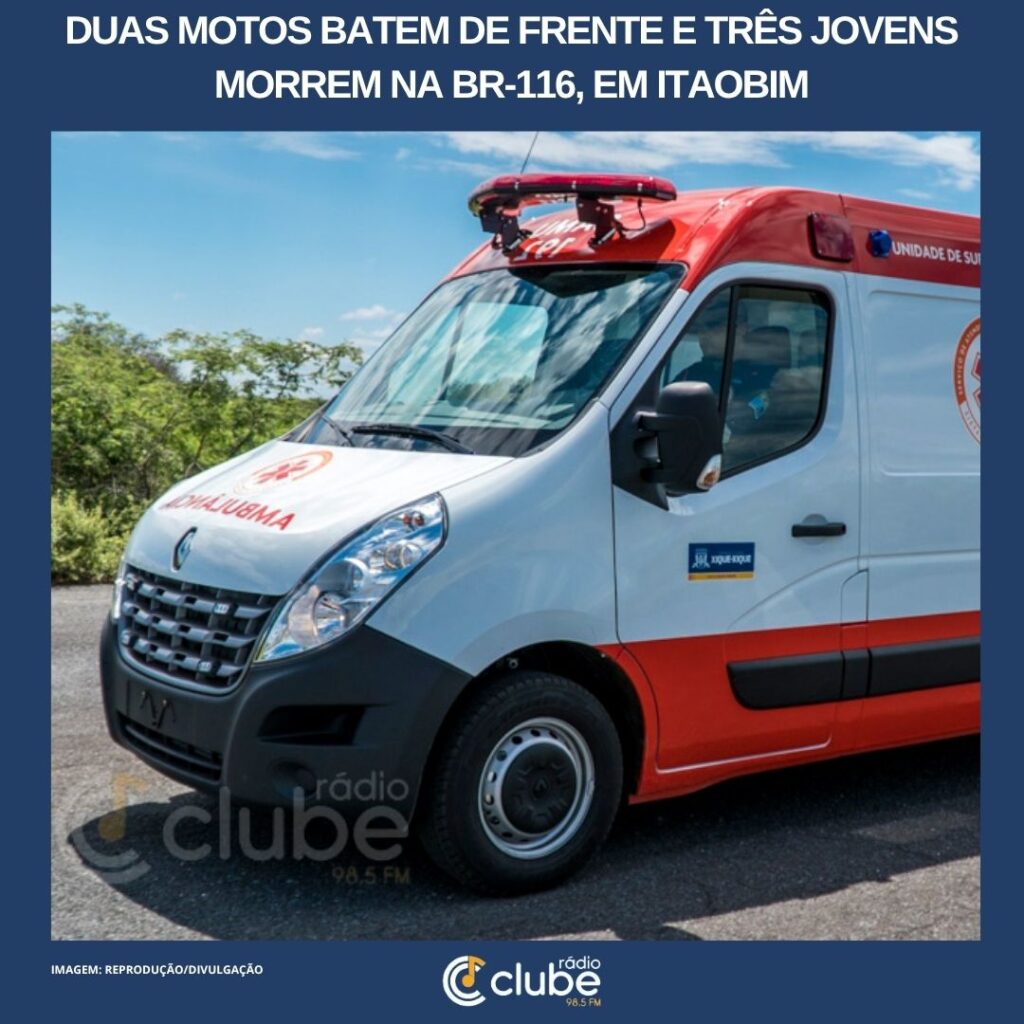 Três jovens morreram em um grave acidente entre duas motocicletas na BR-116, em Itaobim, no Vale do Jequitinhonha, na noite deste domingo (26). Segundo informações da Polícia Rodoviária Federal, as motos bateram de frente no km 128 da rodovia, próximo à entrada da comunidade São João Grande. As vítimas fatais foram identificadas como Gustavo Gomes, […]