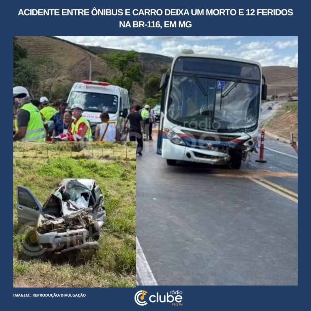 Acidente entre ônibus e carro deixa um morto e 12 feridos na BR-116, em MG