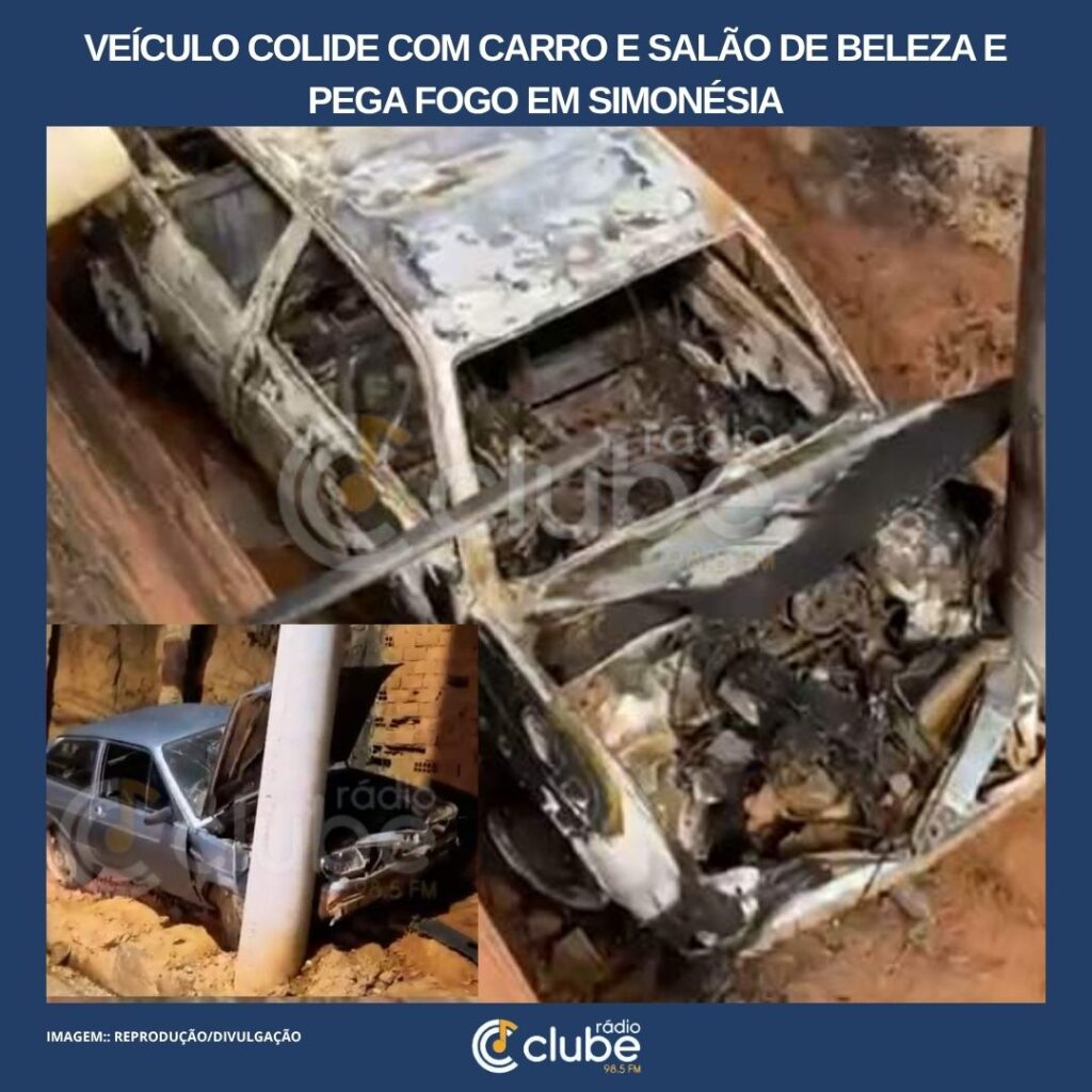 Veículo colide com carro e salão de beleza e pega fogo em Simonésia