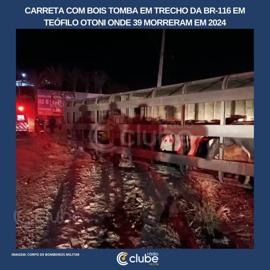 Carreta com bois tomba em trecho da BR-116 em Teófilo Otoni onde 39 morreram em 2024