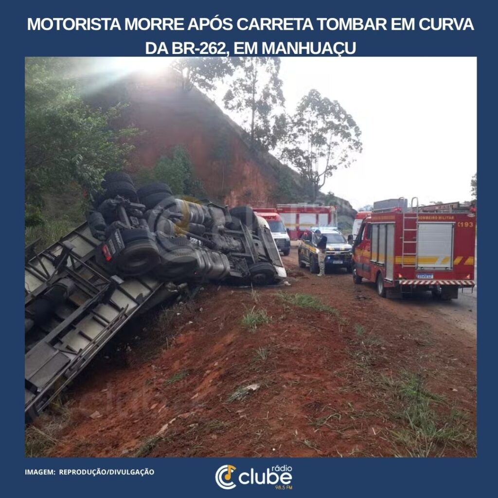 Motorista morre após carreta tombar em curva da BR-262, em Manhuaçu