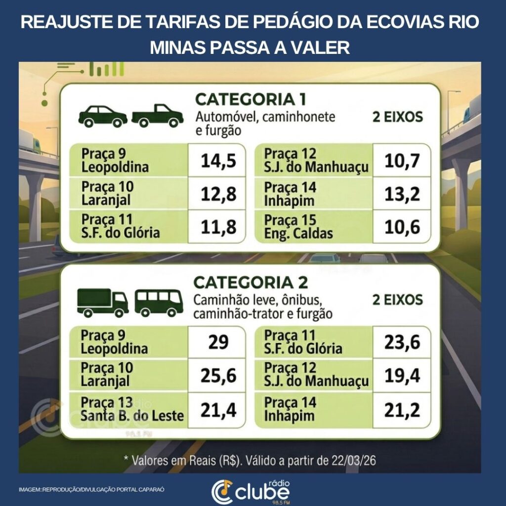As tarifas de pedágio das rodovias administradas pela Ecovias Rio Minas foram reajustadas a partir deste domingo (22/03). A atualização foi aprovada pela Agência Nacional de Transportes Terrestres (ANTT), por meio da Decisão SUROD nº 262, publicada no Diário Oficial da União em 20 de março de 2026.
