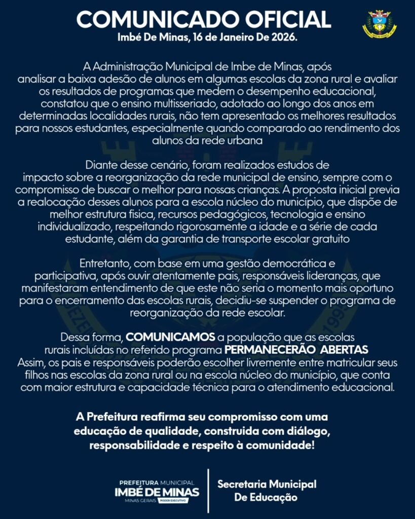 A Prefeitura de Imbé de Minas anunciou, nesta sexta-feira (16), a suspensão do programa de reestruturação da rede municipal de ensino que previa a realocação de alunos de algumas escolas da zona rural para a escola núcleo do município. A decisão foi comunicada por meio de nota oficial divulgada pela administração municipal. De acordo com […]