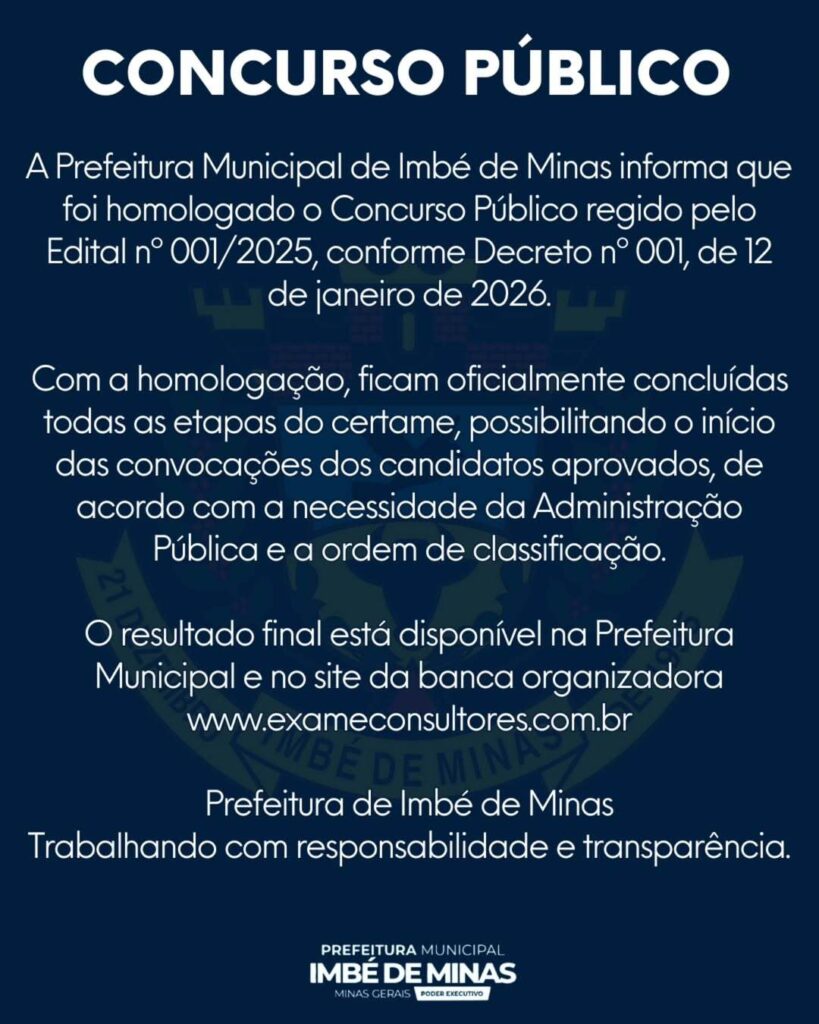 A Prefeitura Municipal de Imbé de Minas homologou oficialmente o Concurso Público regido pelo Edital nº 001/2025. A homologação foi publicada por meio do Decreto nº 001, datado de 12 de janeiro de 2026, encerrando formalmente todas as etapas do certame e autorizando o início das convocações dos candidatos aprovados. Com a homologação, o concurso […]