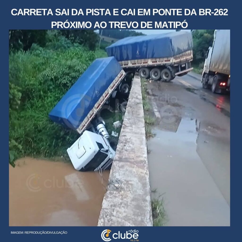 Carreta sai da pista e cai em ponte da BR-262 próximo ao trevo de Matipó