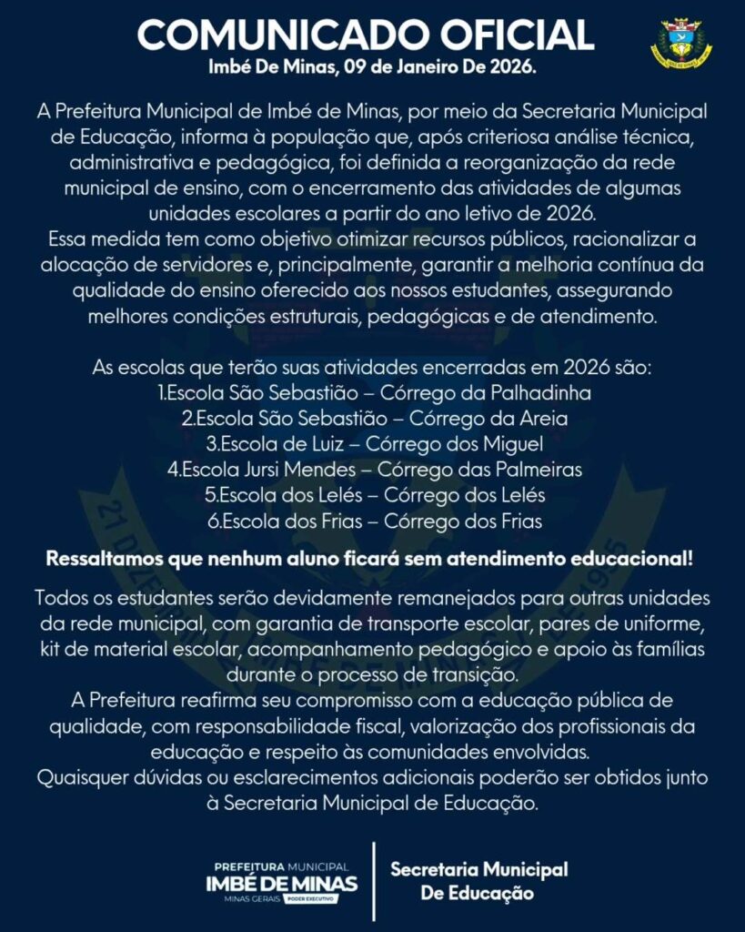 Prefeitura de Imbé de Minas anuncia fechamento de escolas rurais em 2026, mas garante atendimento a todos os alunos