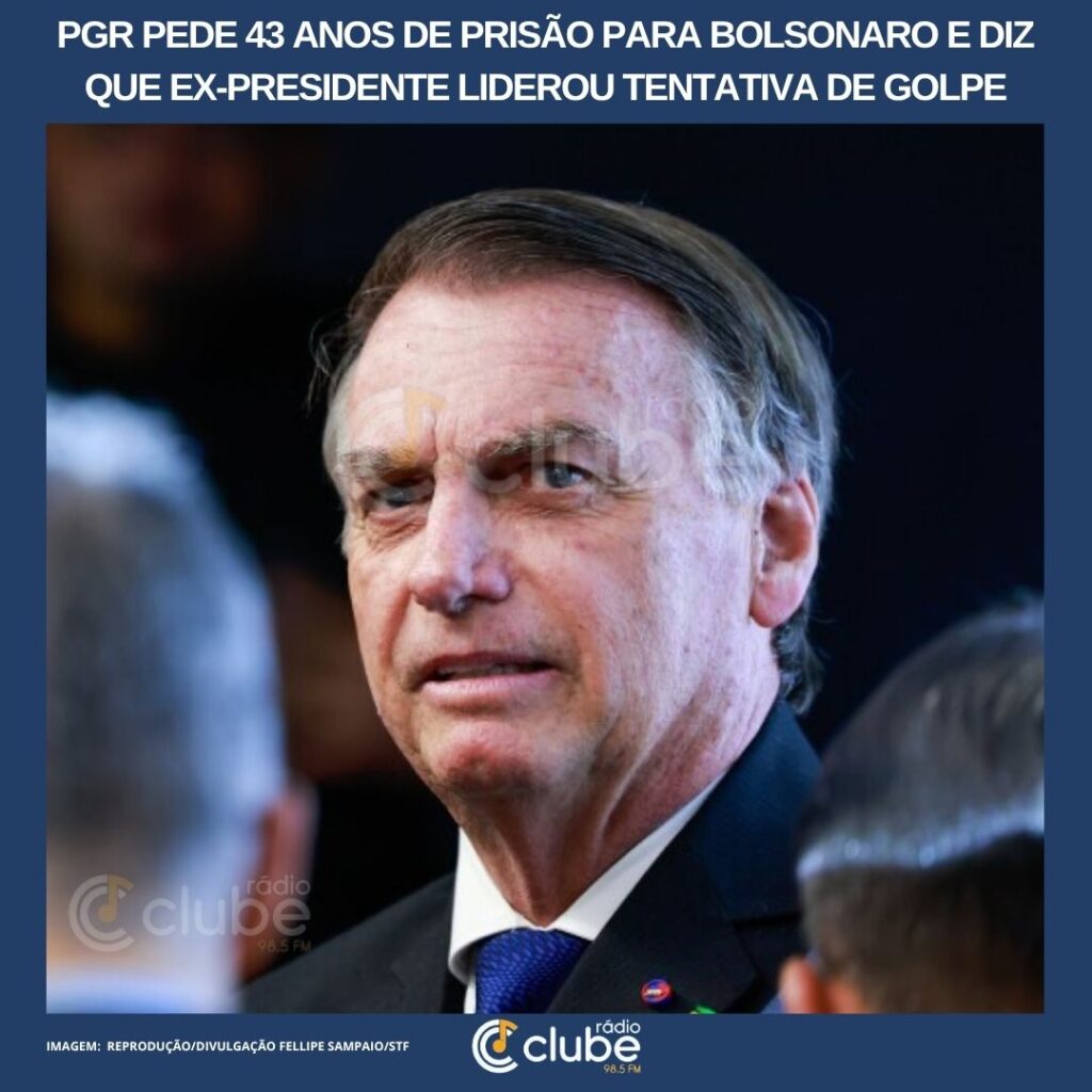 A Procuradoria-Geral da República (PGR) pediu ao Supremo Tribunal Federal (STF) a condenação do ex-presidente Jair Bolsonaro a até 43 anos de prisão. A acusação afirma que ele foi o líder político de um plano golpista que buscava impedir a posse de Luiz Inácio Lula da Silva, mesmo após sua derrota nas eleições. Segundo a […]